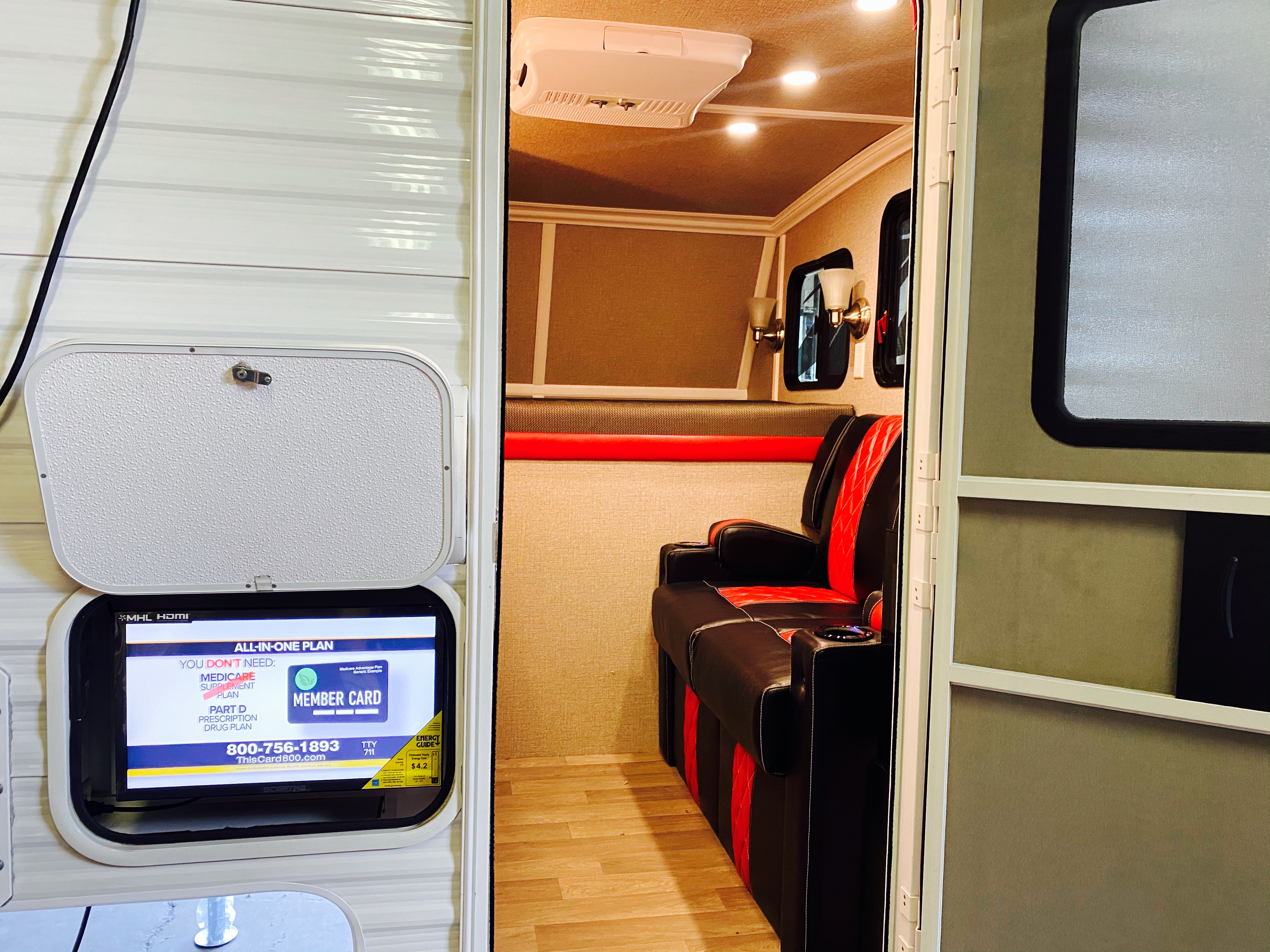 Journey Sport is perfect for a couple who likes to travel and likes being home away from home. Including a massage couch with USB ports, wine cooler, sleeping area for 2 people, 2 TVs, one located inside to watch your favorite shows and one located outside of the unit to sit back and watch some tv while your camping and possibly grilling!
